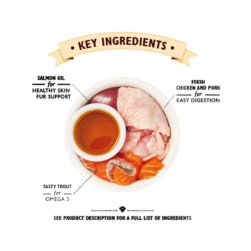 65% Vers bereid: Kip (30%); Forel (10%); Varkensvlees (21%); Rundvlees (4%), Mineralen, zalmolie, algen.