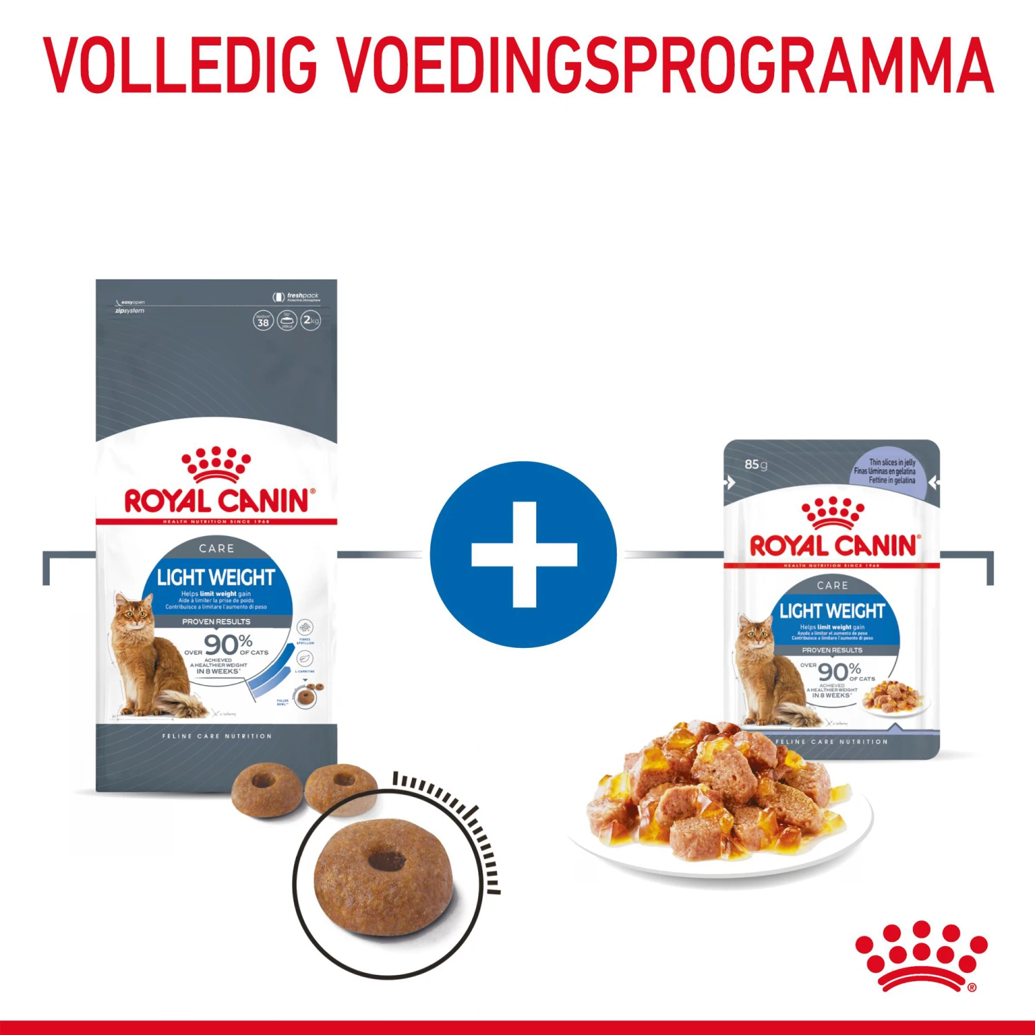 Als een kat (iets) te dik is, wordt de kans op gezondheidsproblemen groter. Denk bijvoorbeeld aan suikerziekte, gewrichtsklachten, leverproblemen of een slechte doorbloeding. Met de Light Weight Care in Jelly van Royal Canin beperk jij de calorie-inname van uw kat. Dit smakelijke voer van vleesblokjes in gelei bevat minder calorieën, dat bijdraagt aan minder calorie-inname voor een gezonder gewicht. Ook ondersteunt het natvoer de urinewegen en de spiermassa.