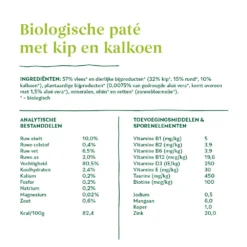 57% vlees* en dierlijke bijproducten* (32% kip*, 15% rund*, 10% kalkoen*), plantaardige bijproducten* (0,0075% van gedroogde aloë vera*, komt overeen met 1,5% aloë vera*), mineralen, oliën* en vetten* (zonnebloemolie*). * = biologisch